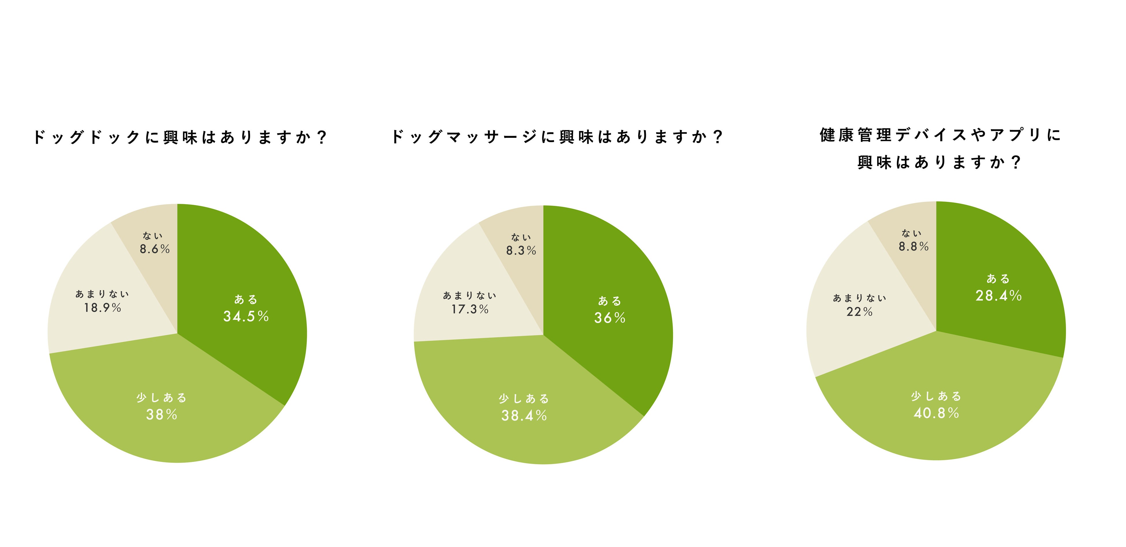 - ドッグドック、ドッグマッサージ 、健康管理デバイス・アプリ に「興味が少しある・ある」と回答した飼い主様はそれぞれ72.5%、74.4%、71.2%と7割超。健康関連サービスに興味関心が高まる