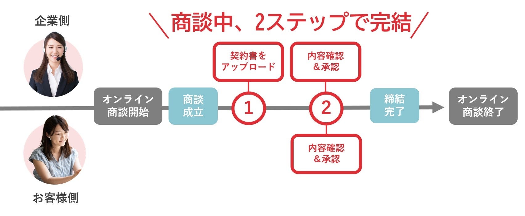 また、オンライン商談システム側の操作のみで完結できるため、スタッフ側もお客様も操作が非常に簡単です。「契約相手の心変わり」「締結完了までのリードタイム」これらの課題を一気に解決できます。