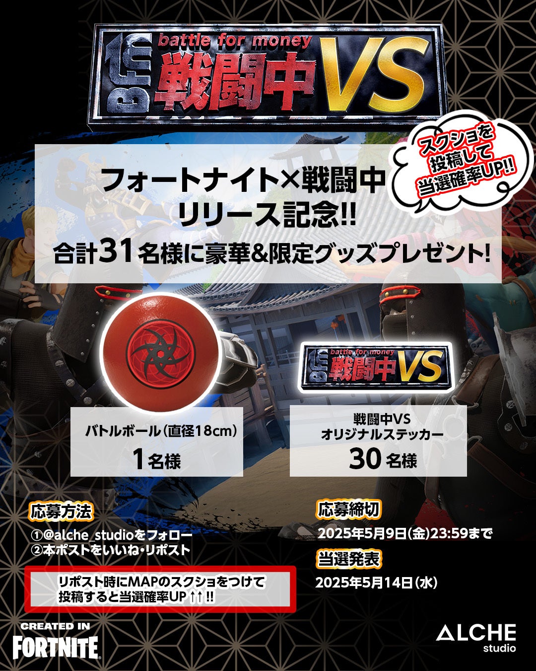 『戦闘中VS』の配信開始を記念して、Alche公式X(旧Twitter)にてフォロー&リポストキャンペーンを開催します。Alche公式アカウント@alche_studioをフォロー&リポストされた方の中から抽選で1名様に戦闘中バトルボール、30名様に非売品『戦闘中VS』オリジナルロゴステッカーをプレゼントいたします。