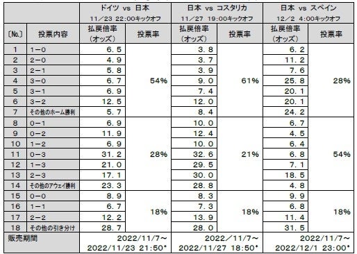 ※1 11月16日(水)10時時点の投票状況となります。払戻倍率(オッズ)は、投票状況により販売終了まで変動します。投票状況は、スポーツくじオフィシャルサイト(https://www.toto-dream.com/)で随時更新しています。