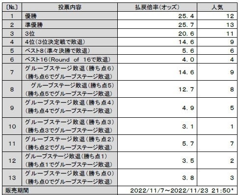 優勝予想の1番人気はブラジルで、払戻倍率(オッズ)は2.8倍!前回大会優勝のフランスは3番人気で、払戻倍率(オッズ)は4.2倍。日本代表は13番人気で、払戻倍率(オッズ)は33.0倍に。