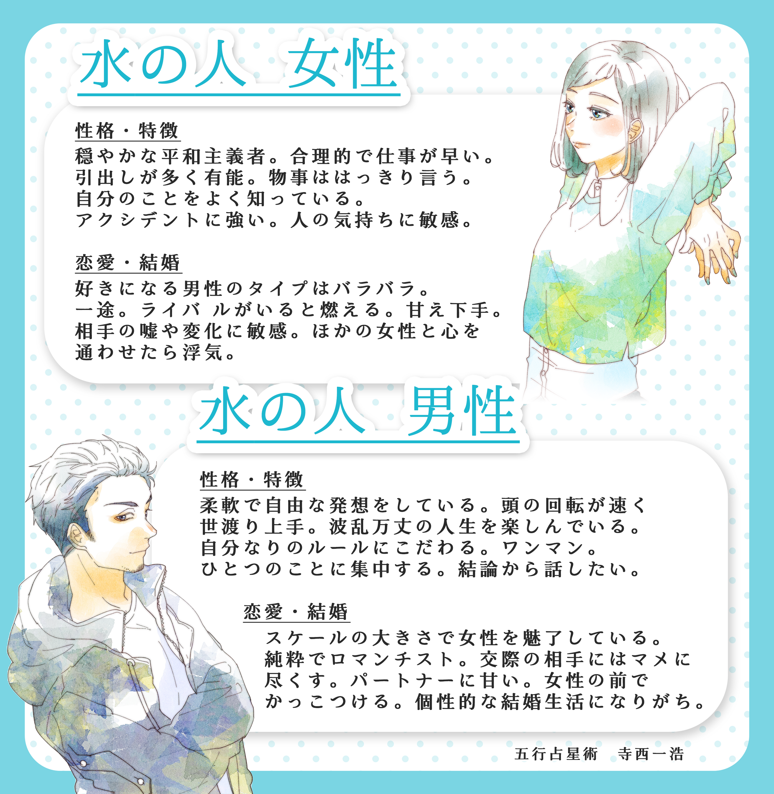作家・映画監督の寺西一浩が、自然界に存在するすべてのものを「木」「火」「土」「金」「水」の五要素に分類する【五行説】を応用し、男女の違いを反映したオリジナルの占星術本を発表し人気だ。