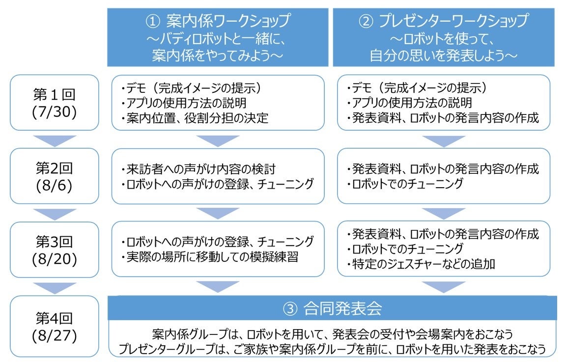 2種類のワークショップを各3回開催し、その後、両グループ合同の発表会を行います。ワークショップを通じ、主に自己表現のツールとしてコミュニケーションロボットを使用した場合の、情緒面、行動面での効果を確認します。