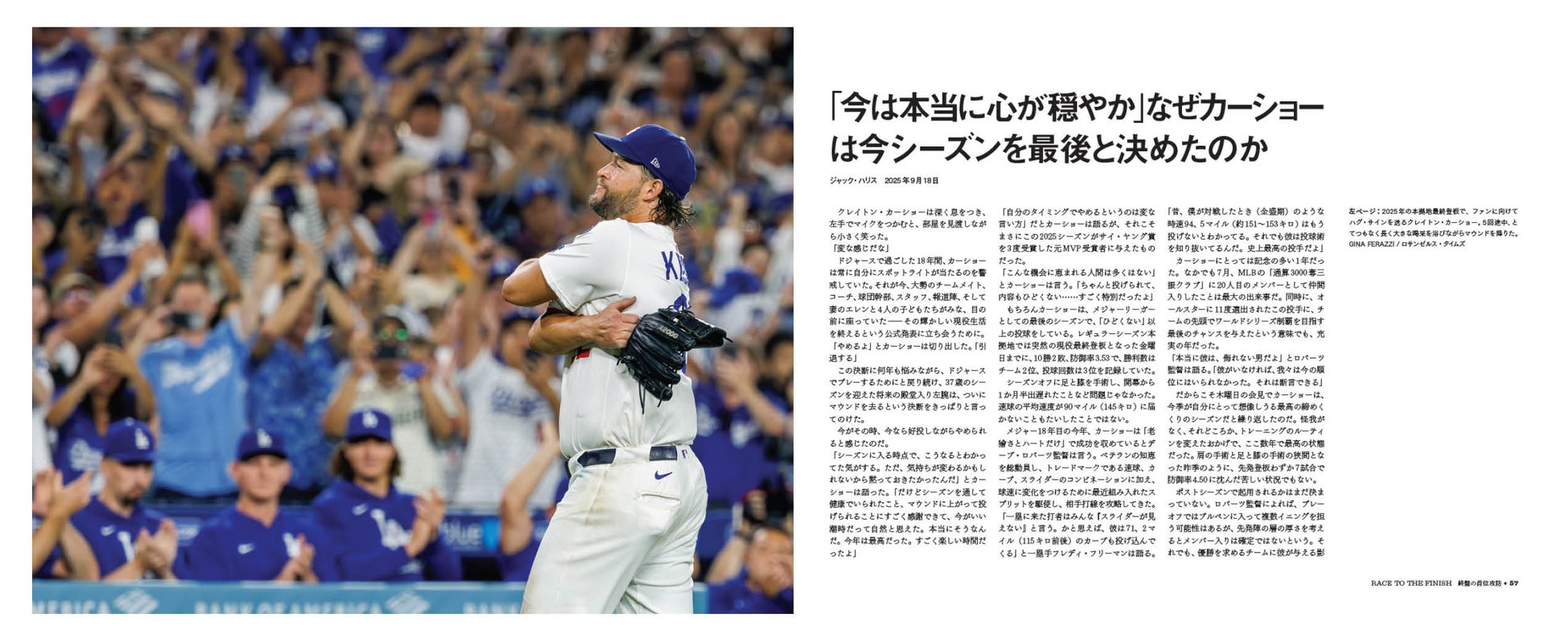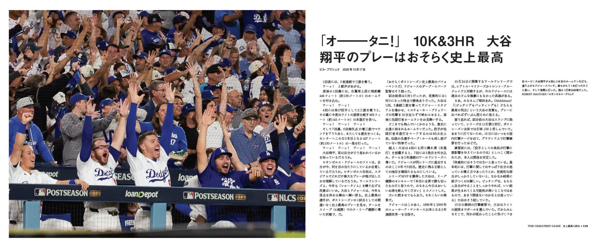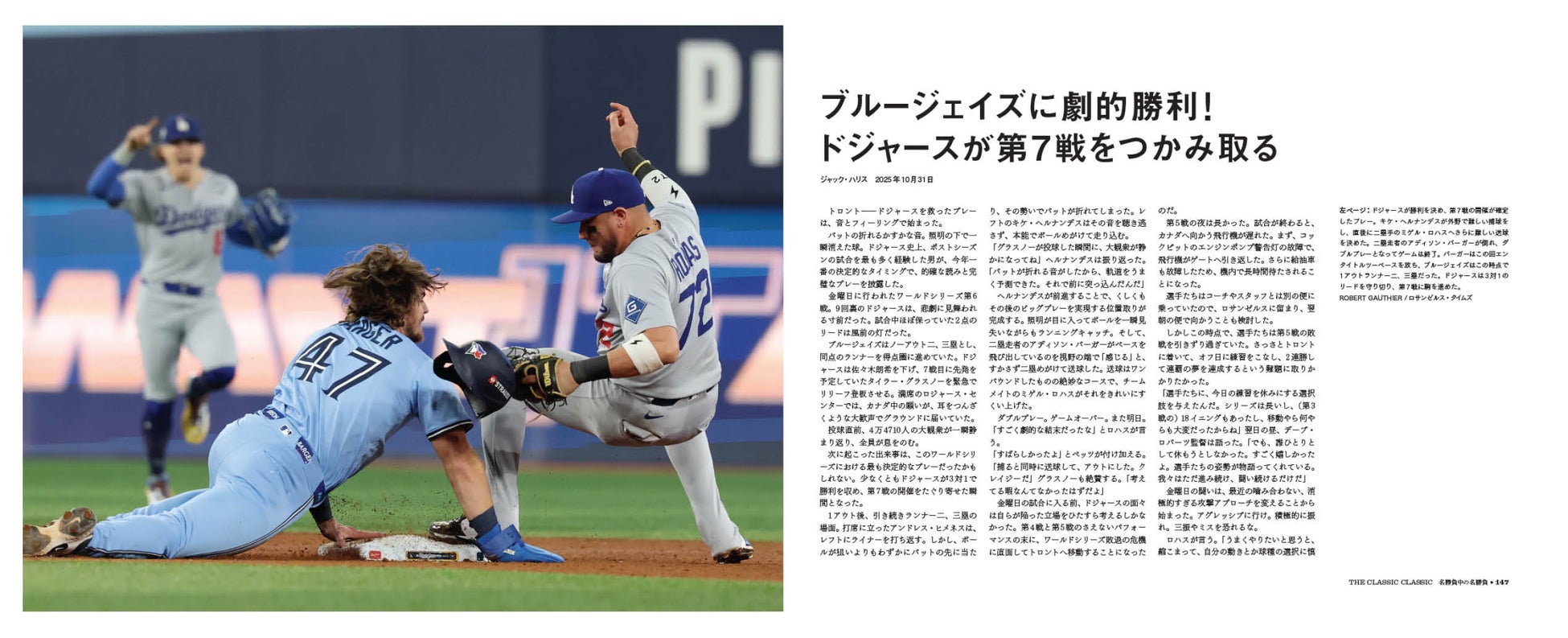 ほかにも、今季で引退を表明していたクレイトン・カーショー投手のインタビューや、18回の死闘に決着をつけたフレディ・フリーマン選手の談話など、迫力ある写真と読み応えたっぷりの記事で構成されています。