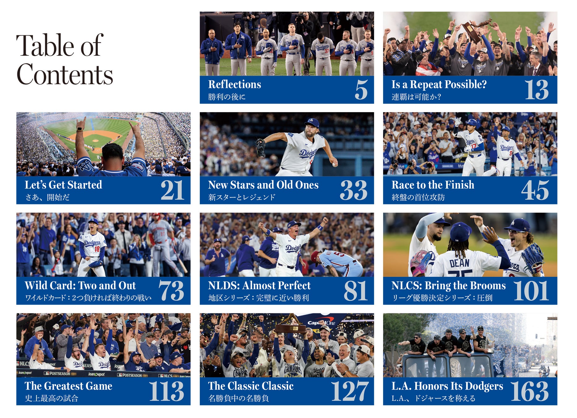 同書は日本開幕戦の「東京シリーズ」から、数々の名場面を生んだ「史上最高のワールドシリーズ」まで、L.A.ドジャースの球団初となる「2連覇」への軌跡を追った永久保存本です。