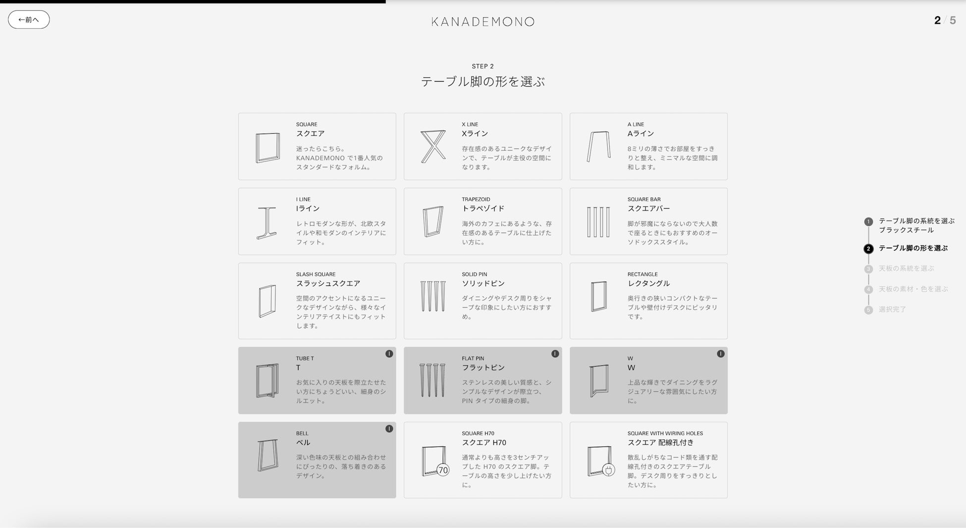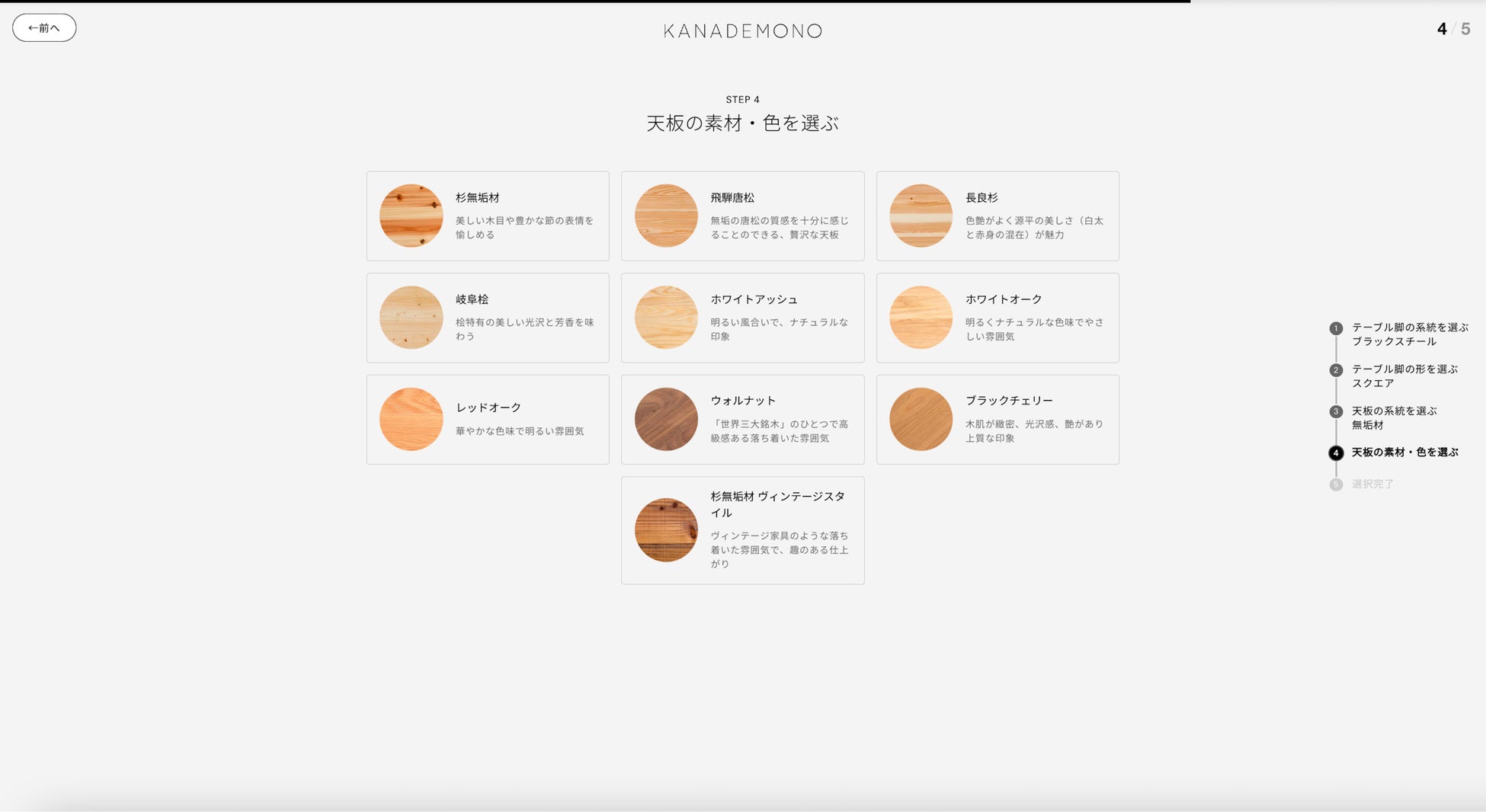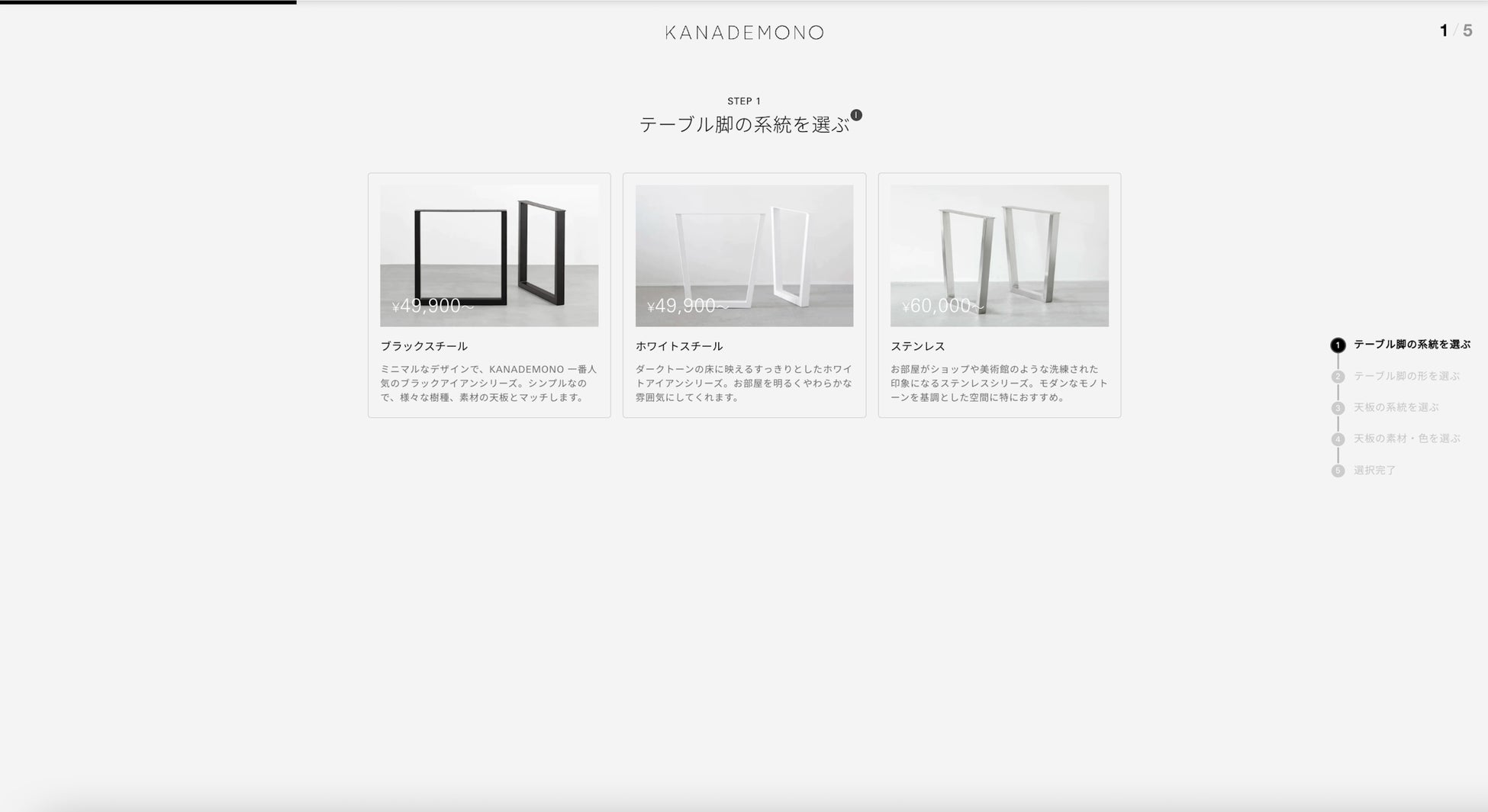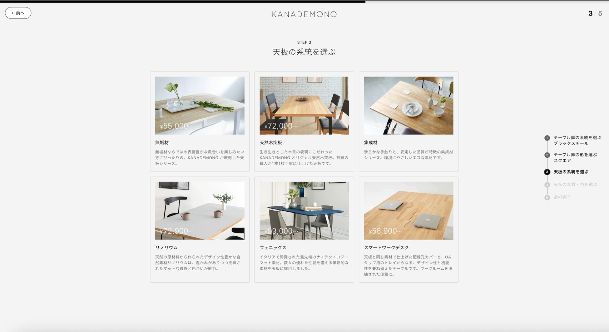 ページの案内に沿って、お好みのデザイン・カラーのテーブル脚と素材・カラーの天板を選ぶことでお客様にぴったりのテーブルを4STEPで導き出すことが可能です。
