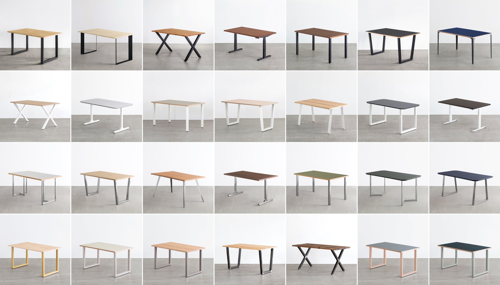 テーブルをはじめとした商品のカスタマイズオーダーを得意としており、空間や用途に合わせてぴったりの家具を提案するために多くのバリエーションを展開しています。天板は木材や機能性素材を活用し、1cmごとに幅・奥行のサイズオーダー、配線孔・面取り加工ができるだけでなく、組み合わせ可能なテーブル脚には70種類以上のデザインからセレクトできます。