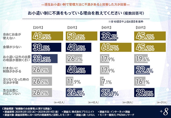 さらに20代では「お小遣い以外の出費の相談が面倒くさい」(33.3%)と感じる人が多く、ルールそのものにストレスを感じやすい傾向があります。一方、30代では「付き合いに制限がかかる」(40.5%)という点も大きな不満要素となっており、仕事上の交際費の負担が増えてくる年代ならではの悩みといえそうです。