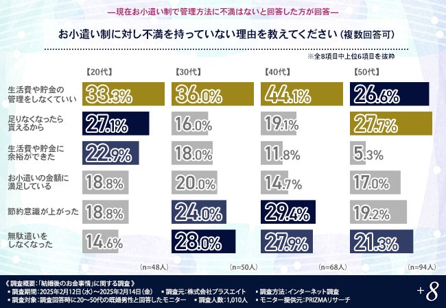 お小遣い制に不満がない人の理由としては、「生活費や貯金の管理をしなくていい」が最も多く、特に20代では家計管理の手間を省ける点が魅力のようです。また、30代以降では「無駄遣いが減った」「節約意識が上がった」というポジティブな声も増えています。
