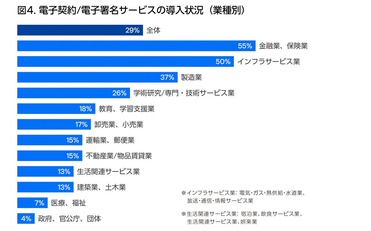 ・電子契約/電子署名サービスの企業・組織での導入率は、昨年の18%から29%と増加、最も導入率が高いのは金融業・保険業の55%