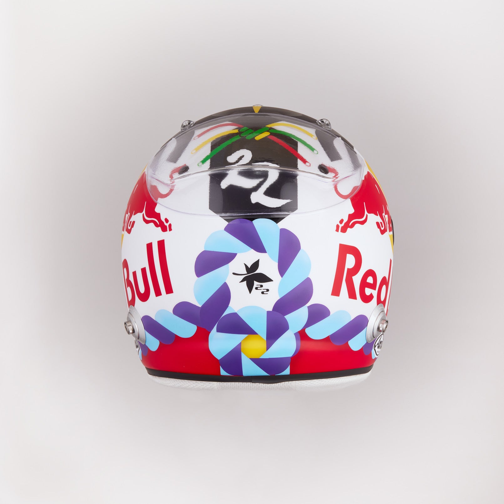 歌舞伎役者でF1日本GPの公式アンバサダーを務める市川團十郎さんがデザイン監修。市川團十郎家に代々伝わる家の芸、歌舞伎十八番の内『暫(しばらく)』をモチーフに、隈取や仁王襷をあしらったデザインとなっており、後頭部には市川團十郎直筆のカーナンバー「22」が描かれています。正面の口元にはRDSのロゴも描かれています。