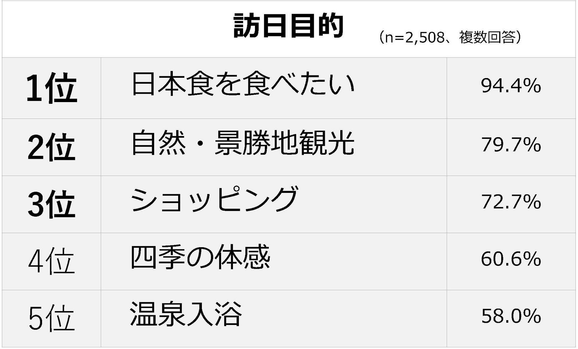 日本を旅行する目的について複数回答で聞いたところ1位は「日本食を食べたい」で、94.4%となり、ほぼすべての回答者が選択しました。2位は「自然・景勝地観光」(79.7%)、そして3位は「ショッピング」で72.7%でした。
