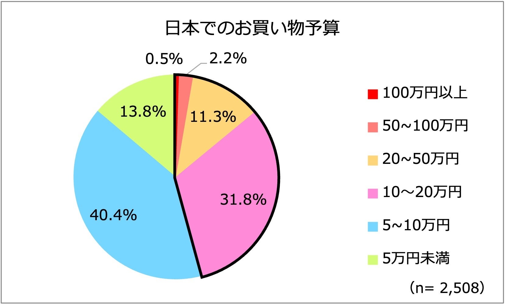 日本での買い物の予算について聞いたところ「5万円~10万円」が40.4%で最多となりました。また「10万円~20万円」の回答が31.8%、「20万円~50万円」が11.3%、「50万円~100万円」は2.2%、「100万円以上」は0.5%となり、全体の45.8%が日本での買い物で「10万円以上」使う意向だということがわかりました。