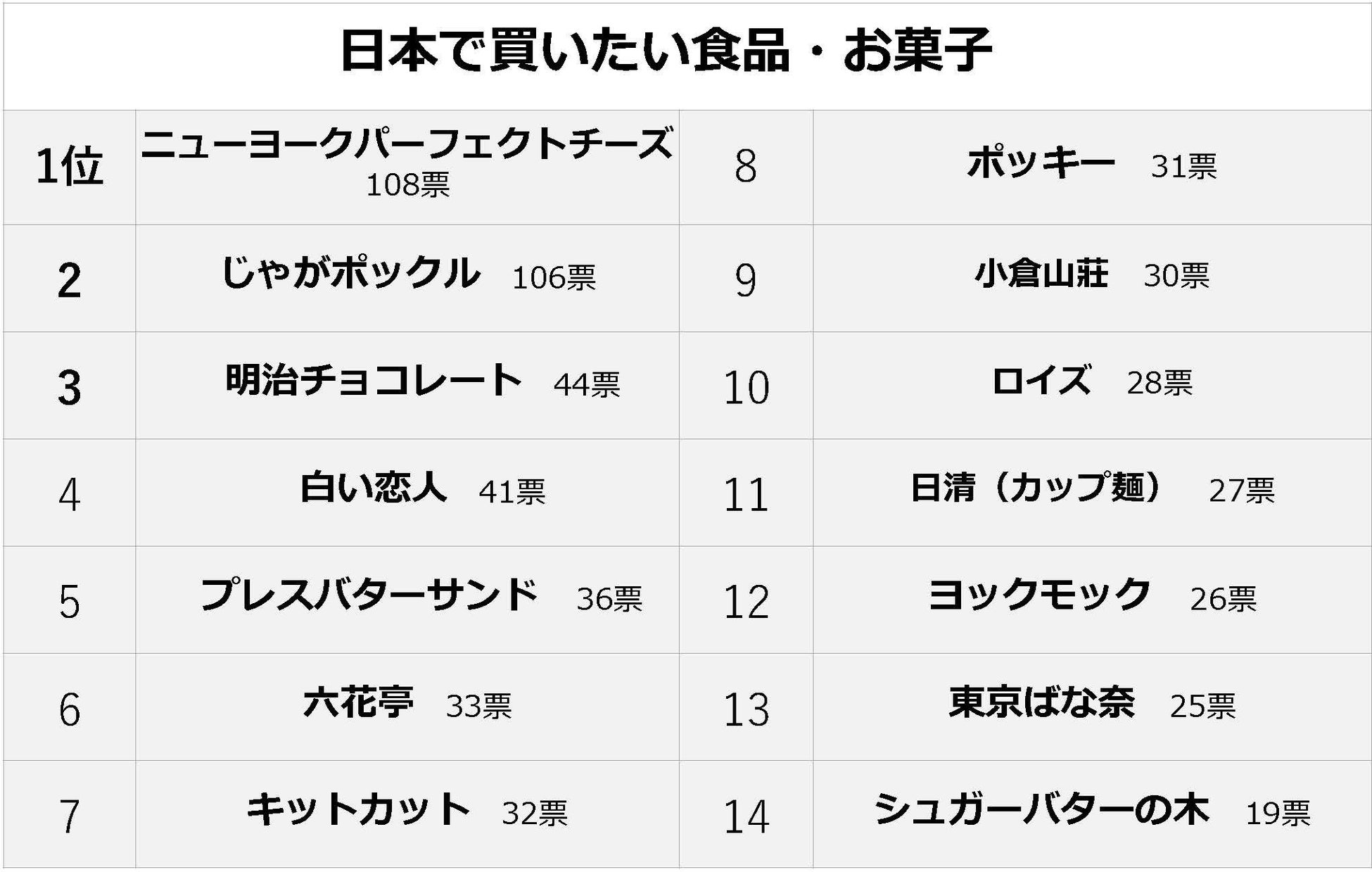 調査では、日本で購入したい食品・お菓子について自由記述で聞きました。具体的な商品名や店舗名を集計したところ、1位はチーズ菓子専門店「ニューヨークパーフェクトチーズ」でした。また、9位には京都に本社を構え、煎餅やおかきを扱う「小倉山荘」が選ばれました。このほか、東京みやげとして愛される「東京ばな奈」が13位にランクインしました。