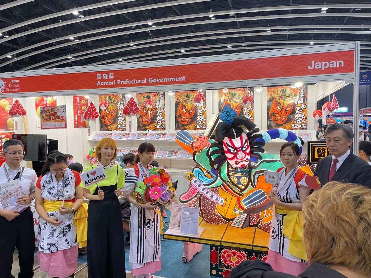 日本政府観光局は、日本のかつての古い町並みの雰囲気を再現した体験型「日本伝統文化館」を設置し、けん玉のパフォーマンス等を披露しました。在香港日本総領事館は、ジャパンパビリオンの紹介動画の撮影に空手のステージイベントを開催したほか、香港でも人気を博す熊本県のくまモンをはじめ、佐賀県の壺侍、宮崎県のむぅちゃん、栃木県のとちまるくんなどご当地キャラクターや、著名な漫画家を輩出した鳥取県から名探偵コナンやゲゲゲの鬼太郎なども登場しました。自治体のブースでは、青森県が「青森ねぶた祭」のミニねぶたの展示や金魚ちょうちんの作成体験を行い、栃木県は東武鉄道と共同で今年7月15日に運行開始したばかりの日光、鬼怒川温泉―東京浅草間の新型特急「スペーシアX」を紹介しました。また、在香港日本国総領事館の岡田健一総領事(大使)や和歌山県の岸本周平知事もジャパンパビリオンを訪れました。