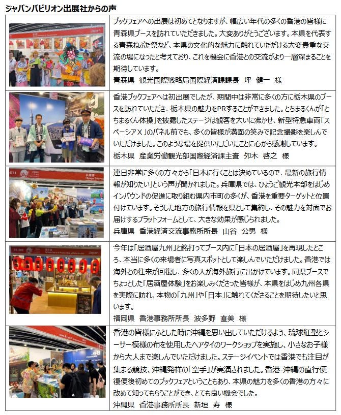日本政府観光局(JNTO)、在香港日本国総領事館、青森県【初】、山形県&新潟県【初】、栃木県【初】、一般社団法人HAKUBAVALLEY TOURISM【初】、北陸・信州(富山県・石川県・福井県・長野県)、岐阜県、兵庫県国際交流協会、和歌山県、鳥取県、広島県観光連盟【初】、中国地域観光推進協議会(鳥取県・島根県・岡山県・広島県 ・山口県)、德島県 (祖谷渓)、福岡県中小企業振興センター、宮崎県物産貿易振興センター、沖縄コンベンションビューロー、九州旅客鉄道株式会社【初】、JTB(香港)、三菱地所・サイモン株式会社【初】