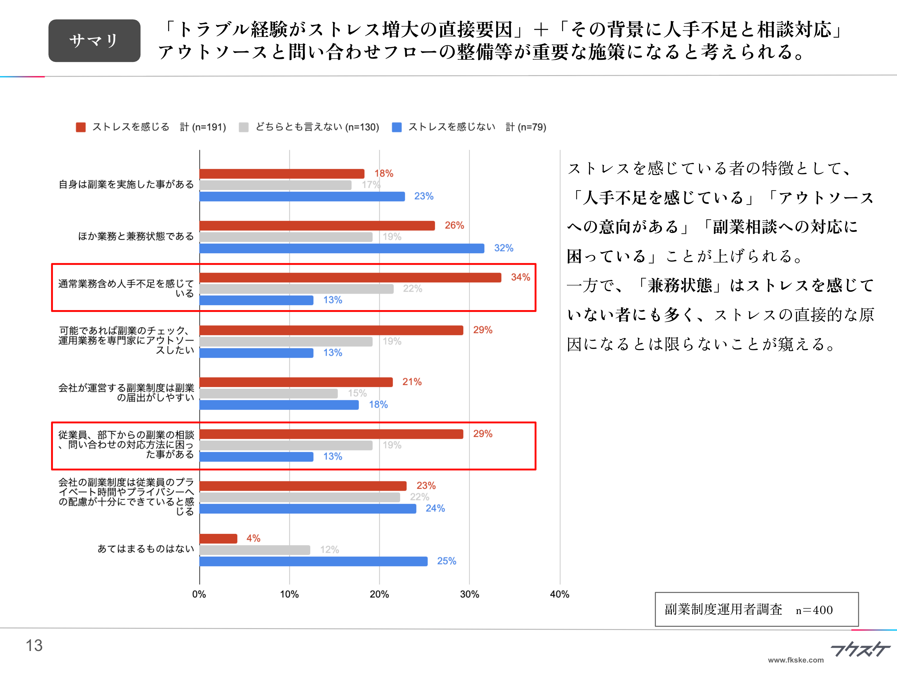 ストレスを感じている者の特徴として、「人手不足を感じている」「アウトソースへの意向がある」「副業相談への対応に困っている」ことが上げられる。