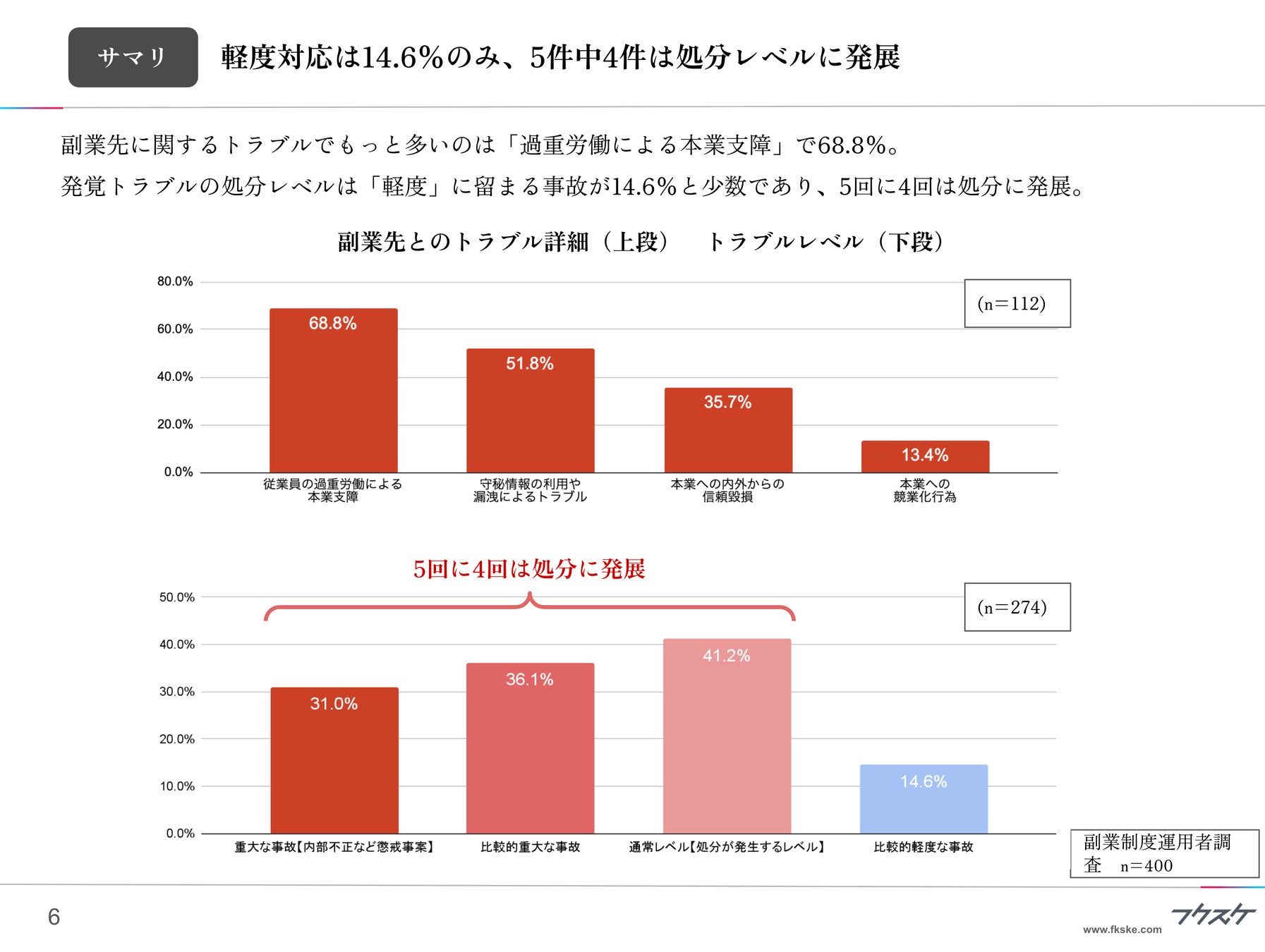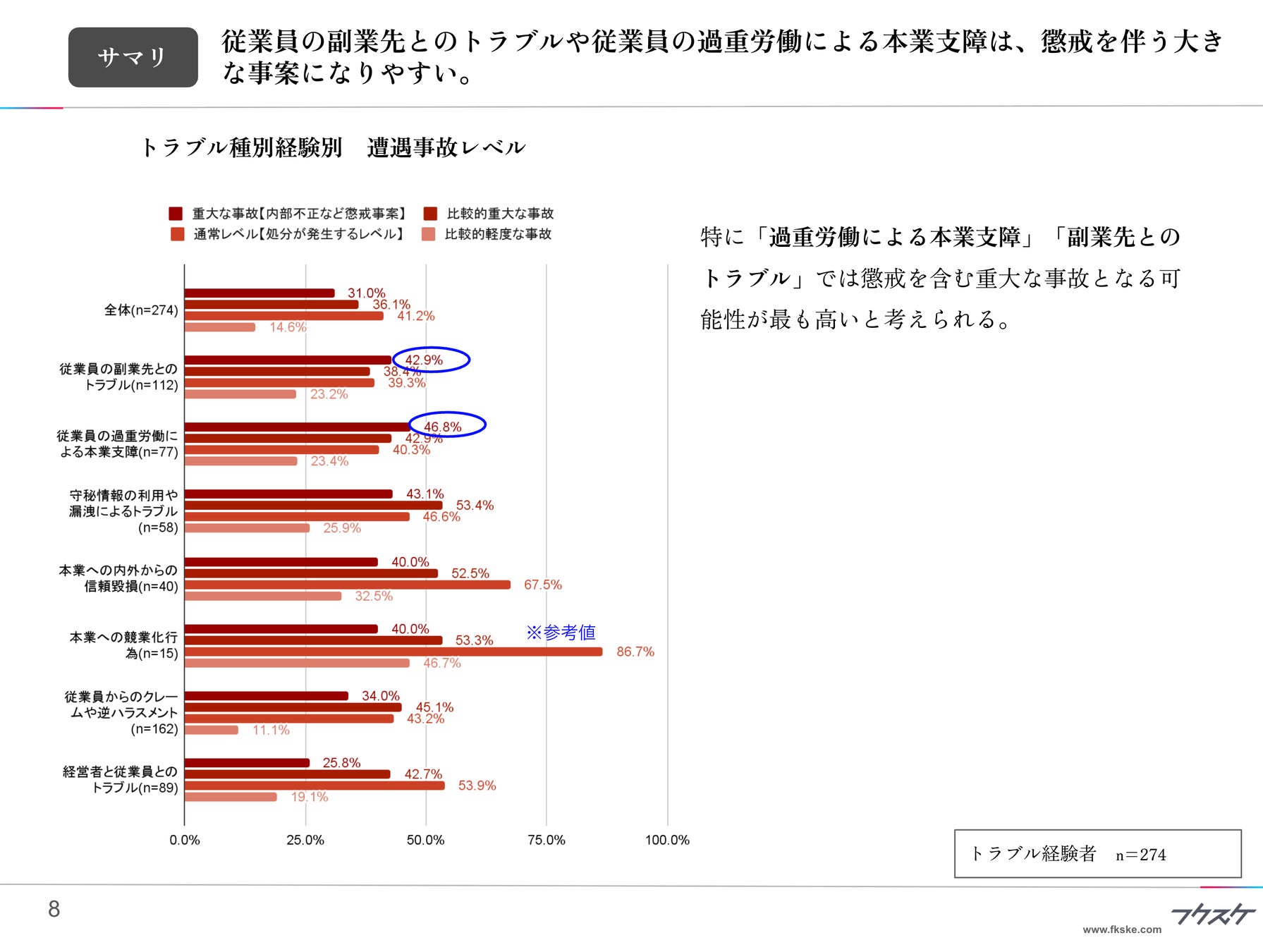 特に「過重労働による本業支障」「副業先とのトラブル」では懲戒を含む重大な事故となる可能性が最も高いと考えられる。