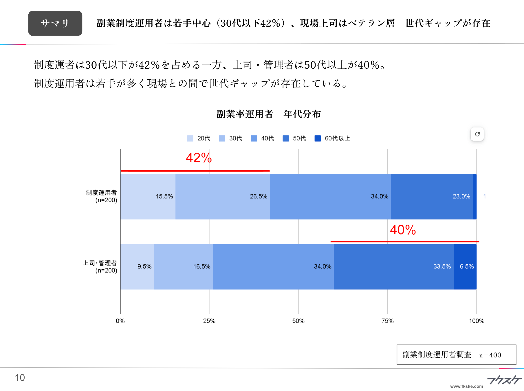 ■副業制度運用者は若手中心(30代以下42%)、現場上司はベテラン層 世代ギャップが存在