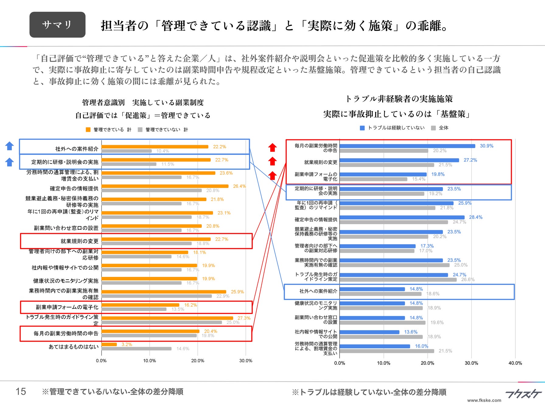 「自己評価で“管理できている”と答えた企業/人」は、社外案件紹介や説明会といった促進策を比較的多く実施している一方で、実際に事故抑止に寄与していたのは副業時間申告や規程改定といった基盤施策。管理できているという担当者の自己認識と、事故抑止に効く施策の間には乖離が見られた。