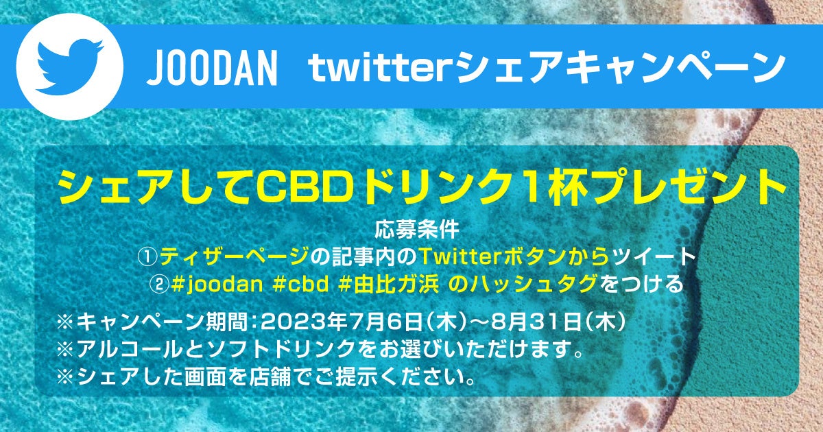 CHILL@BEACH CAFE by JOODAN CBDの最新情報が手入る、ティザーページを公開しております。ティザーページをTwitterで共有すると、7/15(土)から使えるCBDドリンク券(ソフトドリンクorアルコール+ナノCBDドロップ)プレゼント!!