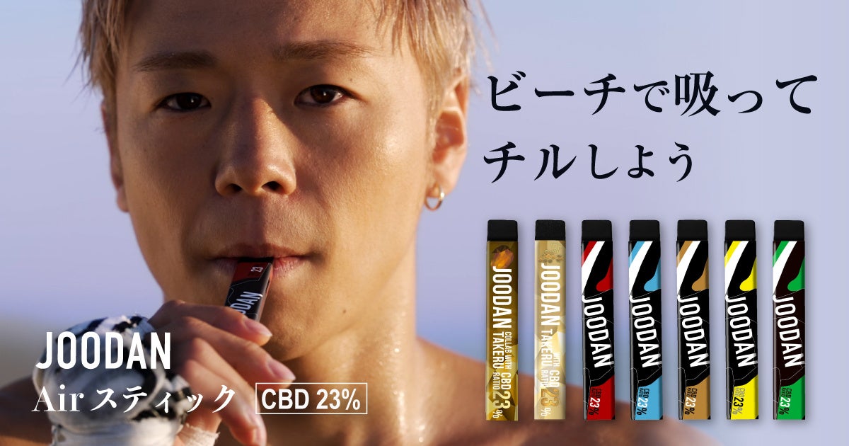 CBD製品は、CBD濃度23%のCBDシーシャ、【JOODAN 23 CBD Airスティックの7フレーバー】を販売します。フレーバラインナップには、馴染みのあるドリンクフレーバーのオロポ、レモンスカッシュ、クリームソーダ、チェリーペッパー、パワーオブターメリックに加え、格闘家武尊選手コラボのメープルマンゴー、マスカットティーの豊富なフレーバーラインナップ。JOODANを買ったらそのままビーチで吸ってチルすることもできます!さらに、新フレーバーの登場も??
