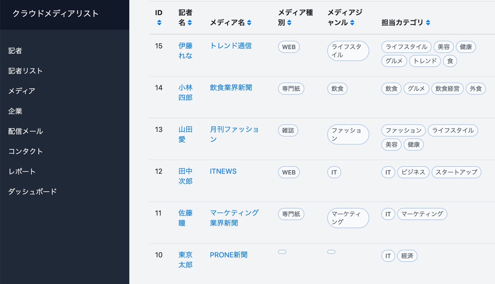 ※1 PRM(Public Relations Management):パブリックリレーションズマネジメントの略。ITテクノロジーを活用して記者の経歴や連絡先、所属部署や担当業界、執筆記事やコンタクト履歴等などのデータを蓄積し、自社とメディアの関係性を管理する概念。