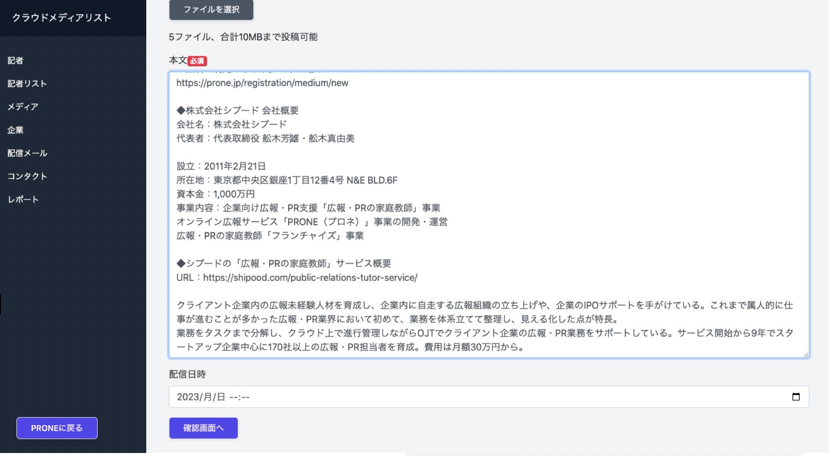 当社が提供してきたオンライン広報サービスPRONE(プロネ:https://prone.jp/ )上に、PRMメディアリスト機能をはじめとしたPRM関連の機能が複数実装されています。