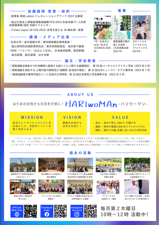 ハリウーマンは、2018 年1 月に発足した姫路・播磨地域の女性を中心とする「女性活躍応援コミュニティ」です。「母」でもなく「妻」でもなく、「1 人の女性」としての時間を楽しむために、20-60 代までの幅広いメンバーで地域密着型の勉強会やイベントを毎月開催しています。