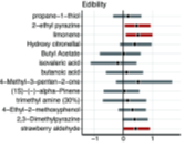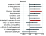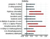 田村研究室は被験者から得られたデータについて階層ベイズマルチ分析を実施。それぞれの要素について相関を調べたところ、13のにおいの中で3つのにおいではEdibility(可食性)という言語評価が赤っぽい色と相関していることが分かりました。また、Edibilityについては他の5つのにおいで黄色っぽい色と相関していることが分かりました。さらに、Arousal(覚醒)という言語評価は2つのにおいで黄色っぽい色と相関がありました。被験者が感じるにおいの「強さ」は色の明るさと関連していることも明らかになりました。このモデルを基にすることで普段私たちが何となくにおいを嗅いでイメージする「色」について規則性を解明し、予測することができるかもしれません。研究の今後にも注目ください。