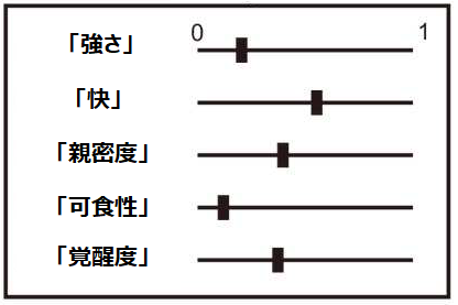 においを色で客観・定量化するためには、においと連想する色のイメージにどのような関係性があるのか?を解明したモデル構築が求められます。この研究は被験者に13種類の匂いを嗅いでもらい、そのにおいを5つの言語表現指標で評価してもらいました(「強さ」「快」「親密度」「可食性」「覚醒度」)。また、においからイメージする「色」をそれぞれ別に評価しました。2つの評価を組み合わせ、被験者がにおいを認知するプロセスの中で、においをどのような言語評価と結び付けているのか。同時に、なぜそのにおいから色を連想したかを探りました。これによってにおいと連想色の関係の間に言語評価軸を持たせることができます。以上のデータから、個人でばらつきのある「においにどういう色印象を持つか」ということについて、予測モデルを構築しました。