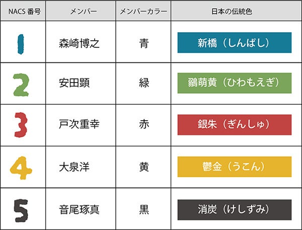 結成25 周年を迎えた演劇ユニットTEAM NACS。メンバーのみなさんの「NACS 番号」と「メンバーカラー」を「SO-SU-U」のデザインに反映させました。「1・森崎博之/青」「2・安田顕/緑」「3・戸次重幸/赤」「4・大泉洋/黄」「5・音尾琢真/黒」を表しています。色はそれぞれ、伝統色に置き換えています。