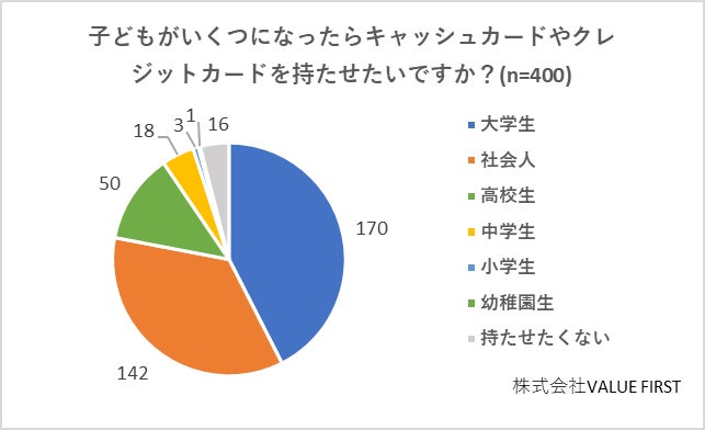 最も多かったのは170名の回答があった「大学生」、次いで「社会人」が142名、大幅に回答数が減り「高校生」が50名、「中学生・小学生・幼稚園生・持たせたくない」は少数という結果でした。