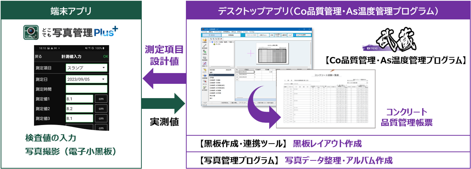 ※コンクリート品質管理プログラム(Co品質管理・As温度管理)と、どこでも写真管理Plusの連携には、別途クラウドサービス「CIMPHINY Plus」および、「黒板作成・連携ツール」が必要となります。詳しくはお問い合わせください。