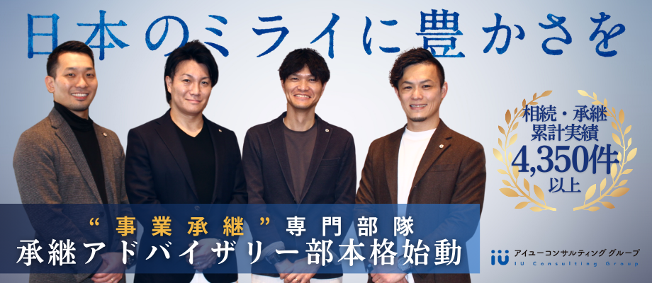 今年1月、当グループの母体組織である税理士法人アイユーコンサルティングで発足した「承継アドバイザリー部」は、事業承継専門の税理士・公認会計士を含む計4名で構成。責任者を務める松下は大手税理士法人で長年事業承継コンサルティング業務に従事しており、2022年に当グループへ参画しました。今後は松下を中心に、東京・福岡の2拠点体制で全国の事業承継支援を行う方針です。