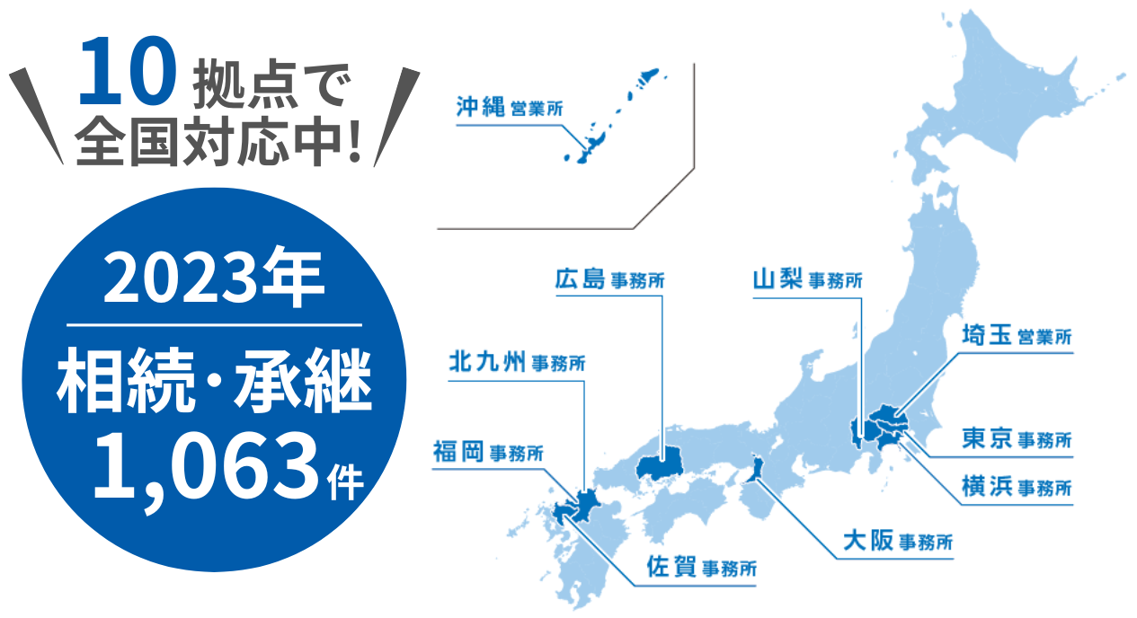 2013年の創業以来、相続・事業承継案件に特化した税理士法人として延べ4,350件以上の実績を誇ります。直近2023年は、過去最高となる年間案件1,000件を突破。スピーディかつ高品質なサービスの提供を強みに、10拠点体制で全国に対応しています。