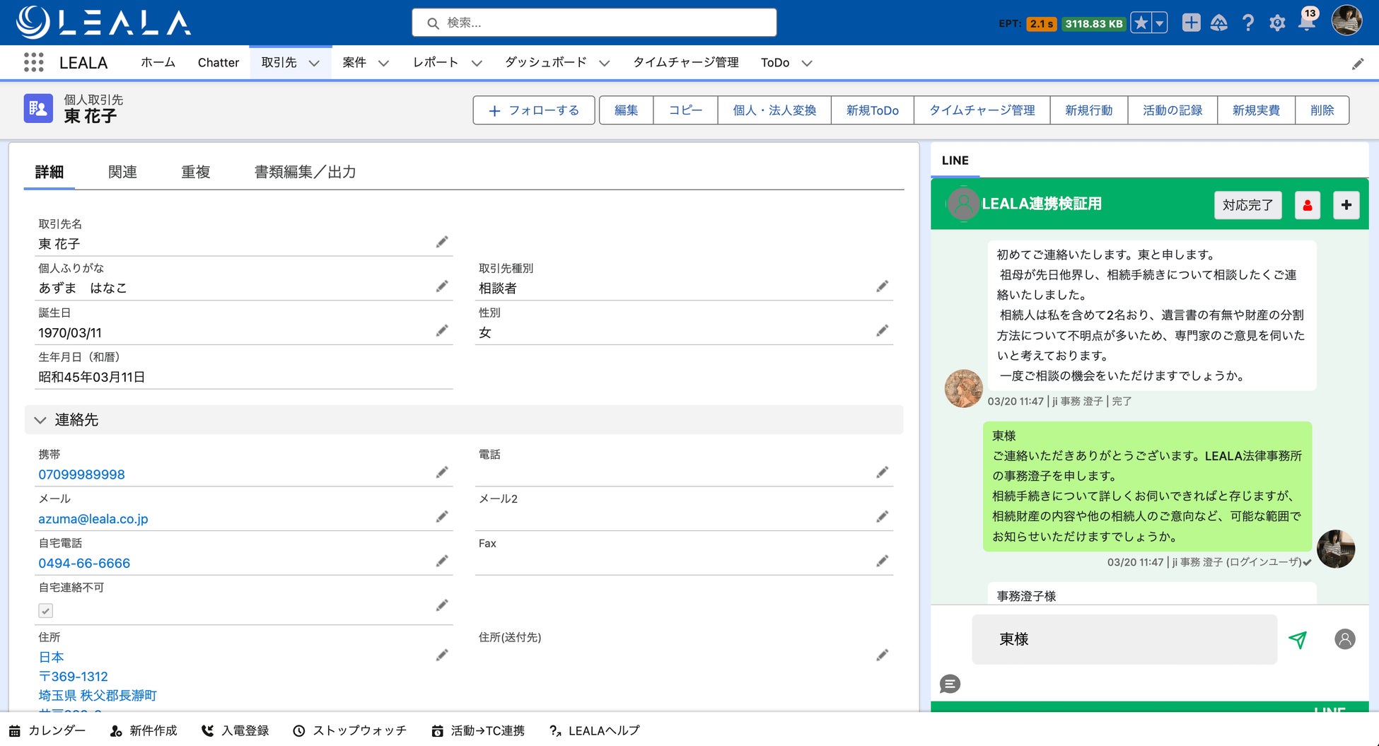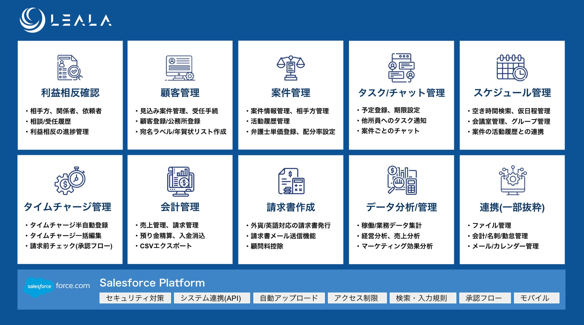 株式会社レアラが提供する『LEALA』は、世界最高水準のセキュリティ性を誇る顧客案件管理システム"Salesforce"を開発基盤にした法律事務所特化型の業務支援システムです。