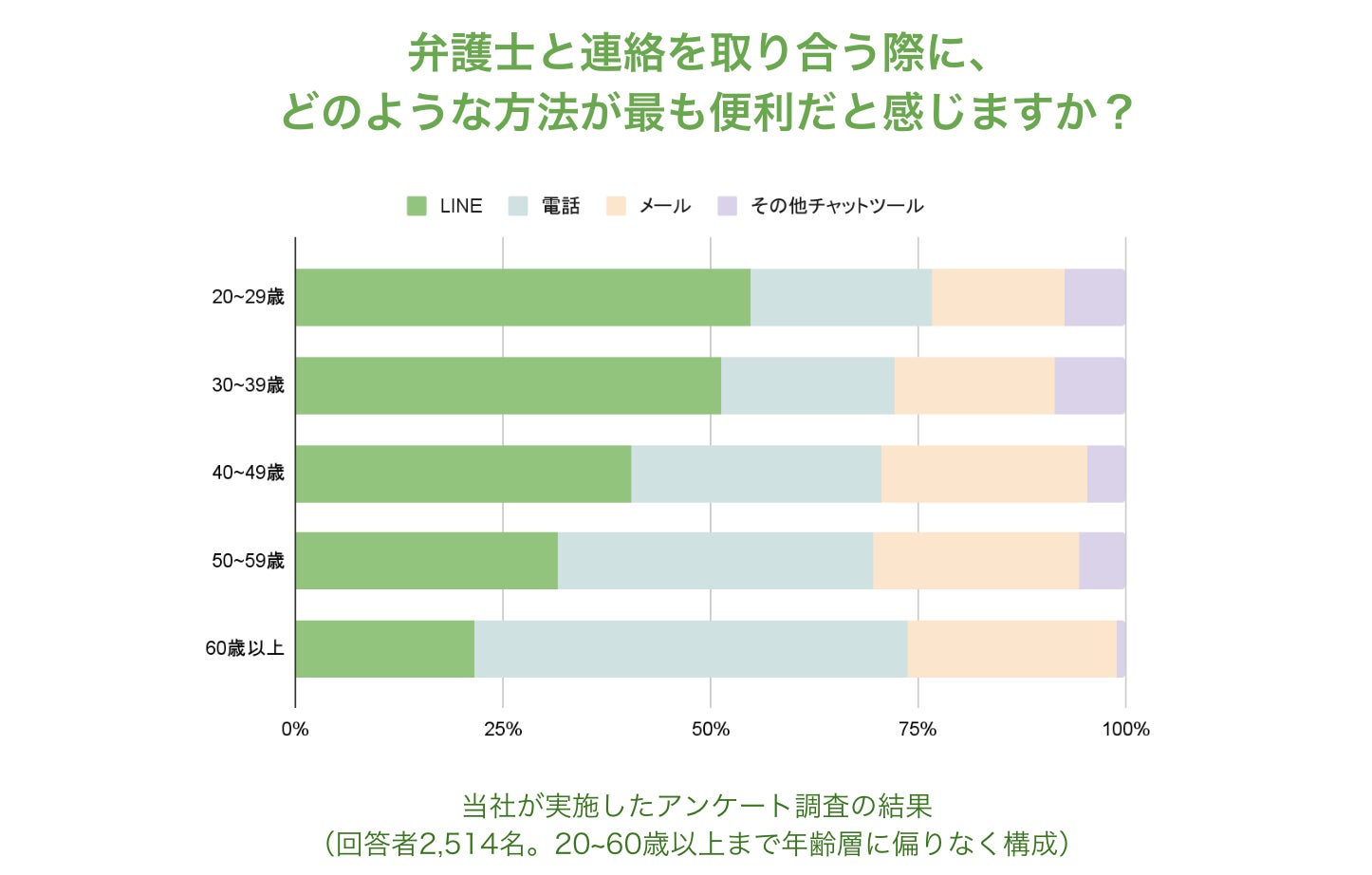 なかでもLINEでの問合せが可能であることは、相談のハードルを下げる要因となり、50.4%が弁護士選びの判断材料になると回答※3。特に50歳未満の層には、LINEが最も便利な連絡手段として支持されています。