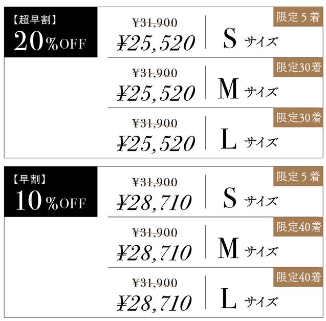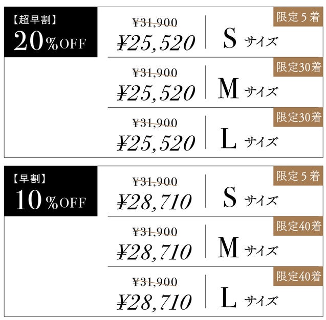 - 【早割10%オフ】 28,710円 Sサイズ5着 Mサイズ40着 Lサイズ40着限定