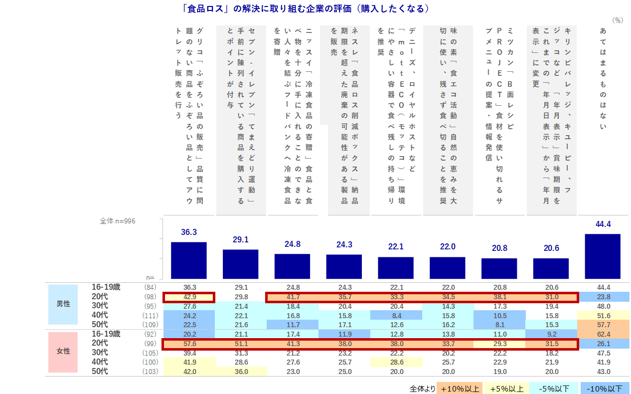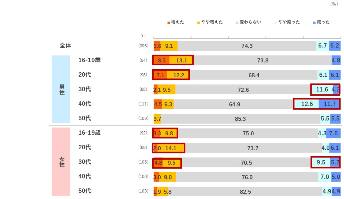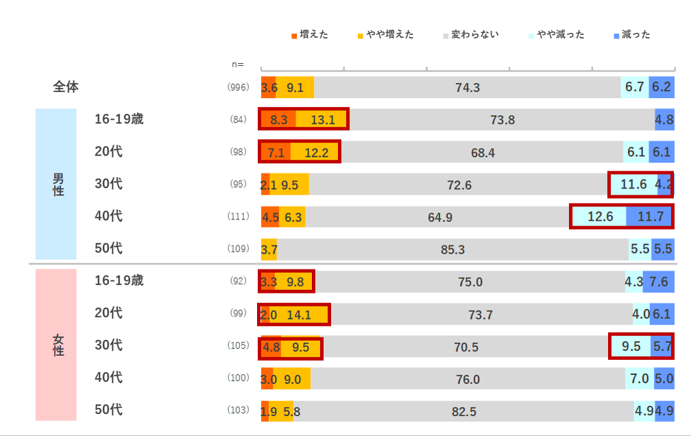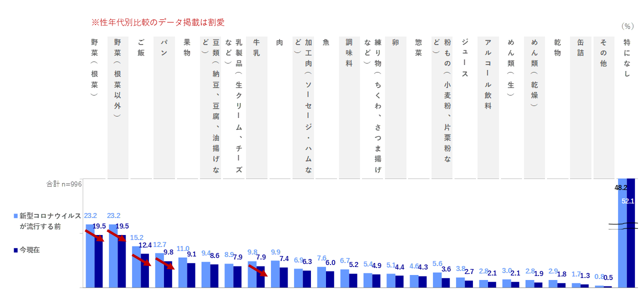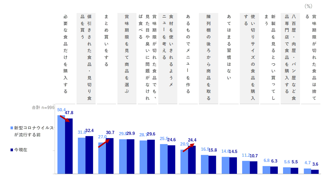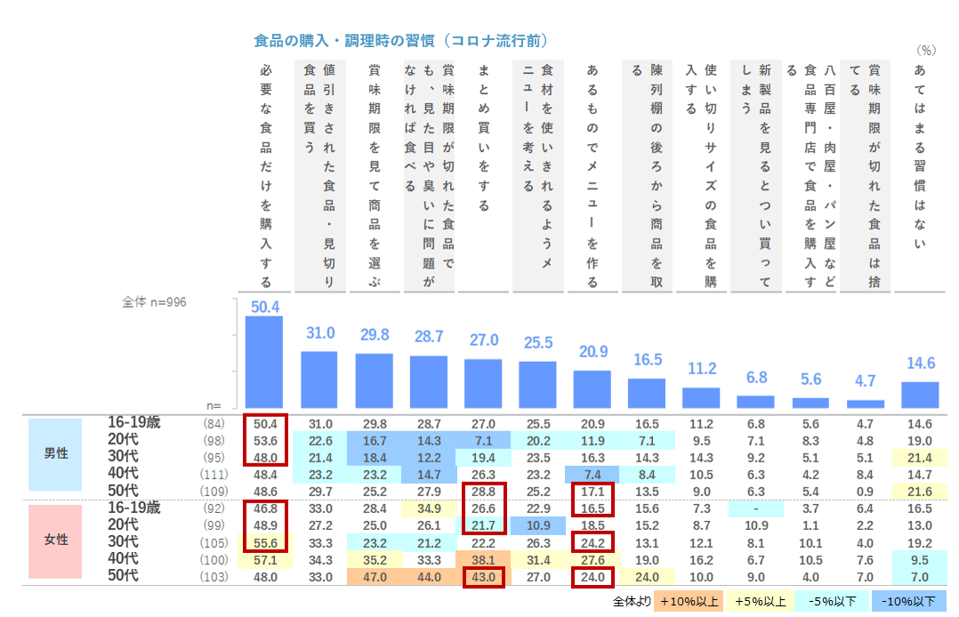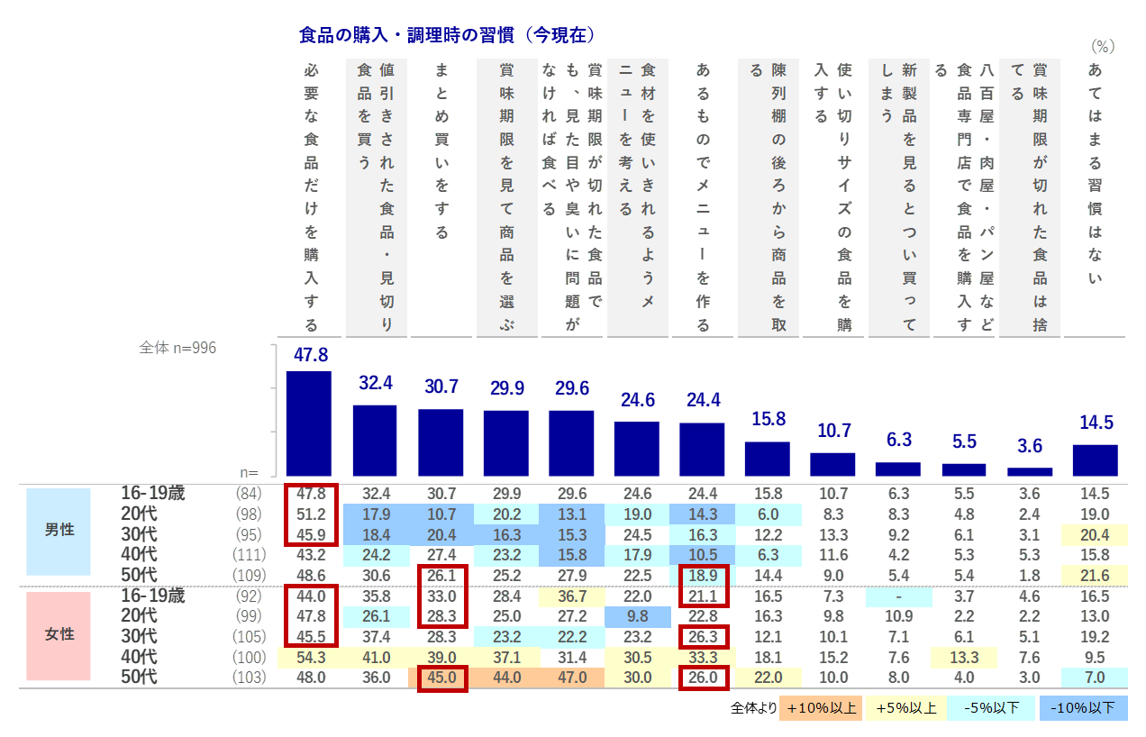 12.1pts増加しています。また、「あるものでメニューを作る」は、女性10・30代、男女50代で+4.3~8.8pts増加しました。一方、「必要な食品だけを購入する」は男性30代で▲5.2pts, 女性20代で▲10.1ptsをはじめ、男女とも10~30代の若年層で減少している傾向が見られました。