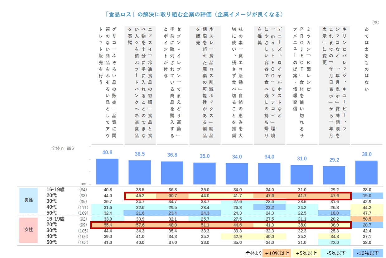 - 全体で「あてはまるものはない」が4割と一定数いる一方、残りの6割は企業イメージ・購入意向にポジティブに影響がある。特に男女とも20代への影響力が強い。