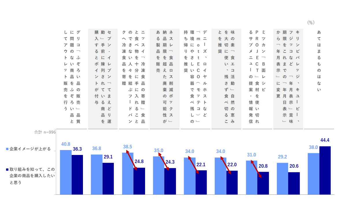 ■最後に、各企業の様々取り組みを呈示して生活者に印象を聞きました。「冷凍食品の寄贈」「食品ロスの削減ボックス」「食べ残しの持ち帰り推奨」など、企業イメージに一定の良い影響は見られましたが、購入意向との差が10pts以上と購入意向へのバリアは強めの様子が窺えました。また「ふぞろい品のアウトレット販売」や「てまえどりでポイント付与」など、消費者に直接的な還元がある施策の方が企業イメージ・購入意向とも高まる傾向も見られます。経済活動とのバランスが各社難しいところのようです。