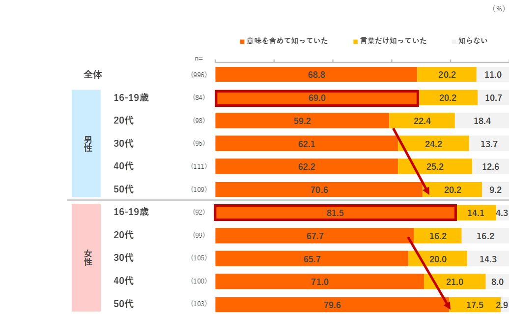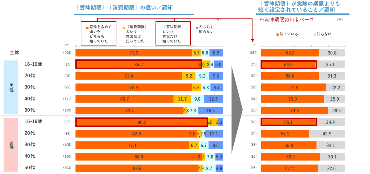 - 「意味を含めて違いをどちらも知っていた」は全体で8割、特に男女とも10代が9割と各世代で最も高い。一方で、「賞味期限」が実際の期限より短く設定されていることの認知は全体で7割。10代は言葉の認知が高いが、「賞味期限」の設定期限の認知は男女とも全体(69.2%)より下回る。