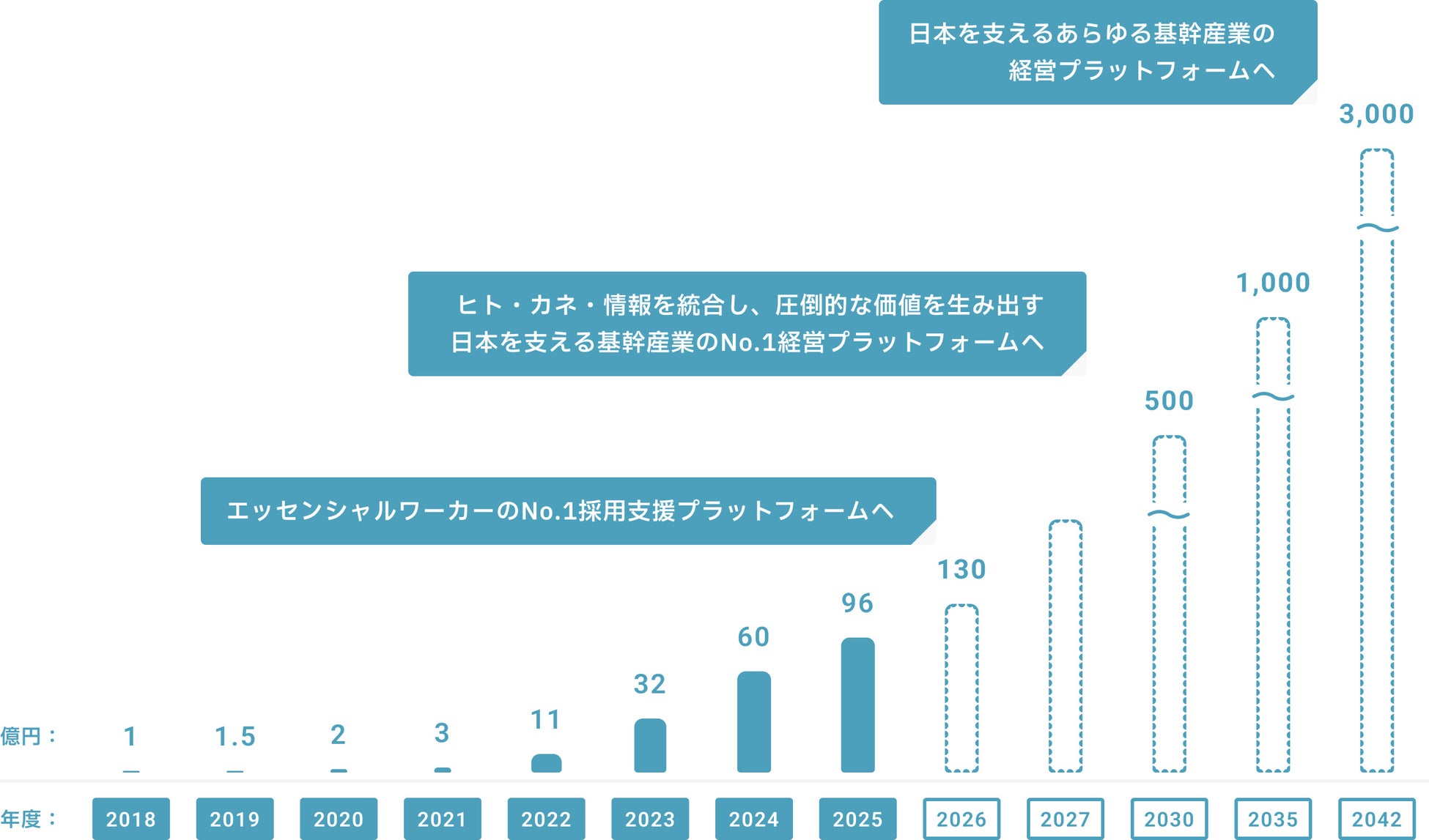 96.1億円という数字は非常に大きいものですが、目標の3,000億という数字に比べると、プレックスという会社はまだ序章にすぎません。2030年の売上500億円、2042年の売上3,000億円という目標に向けて、枠を超えた事業展開をさらに加速させていきます。