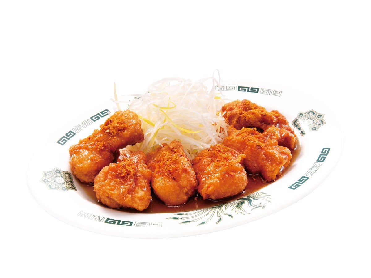 今回のリニューアルでは、2023年12月22日(金)より販売しているおつまみメニュー「ドラゴンチキン」がW(ダブル)=6個になって定食の仲間入り。甘辛ソースと10種類以上の原料をミックスした辛スパイスでご飯がすすみます。