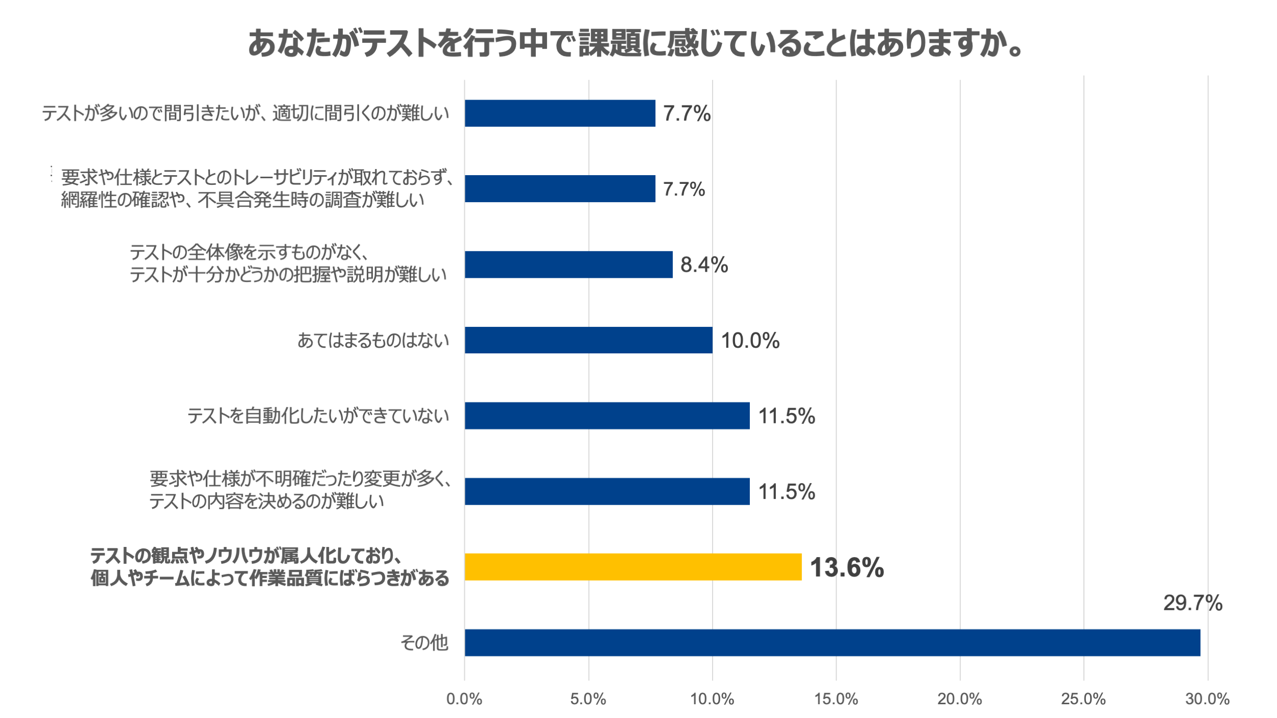 【1】 ソフトウェアテスト、品質保証に関する課題では、「テストの観点やノウハウが属人化しており、個人やチームによって作業品質にばらつきがある」が「その他」を除いて最多。