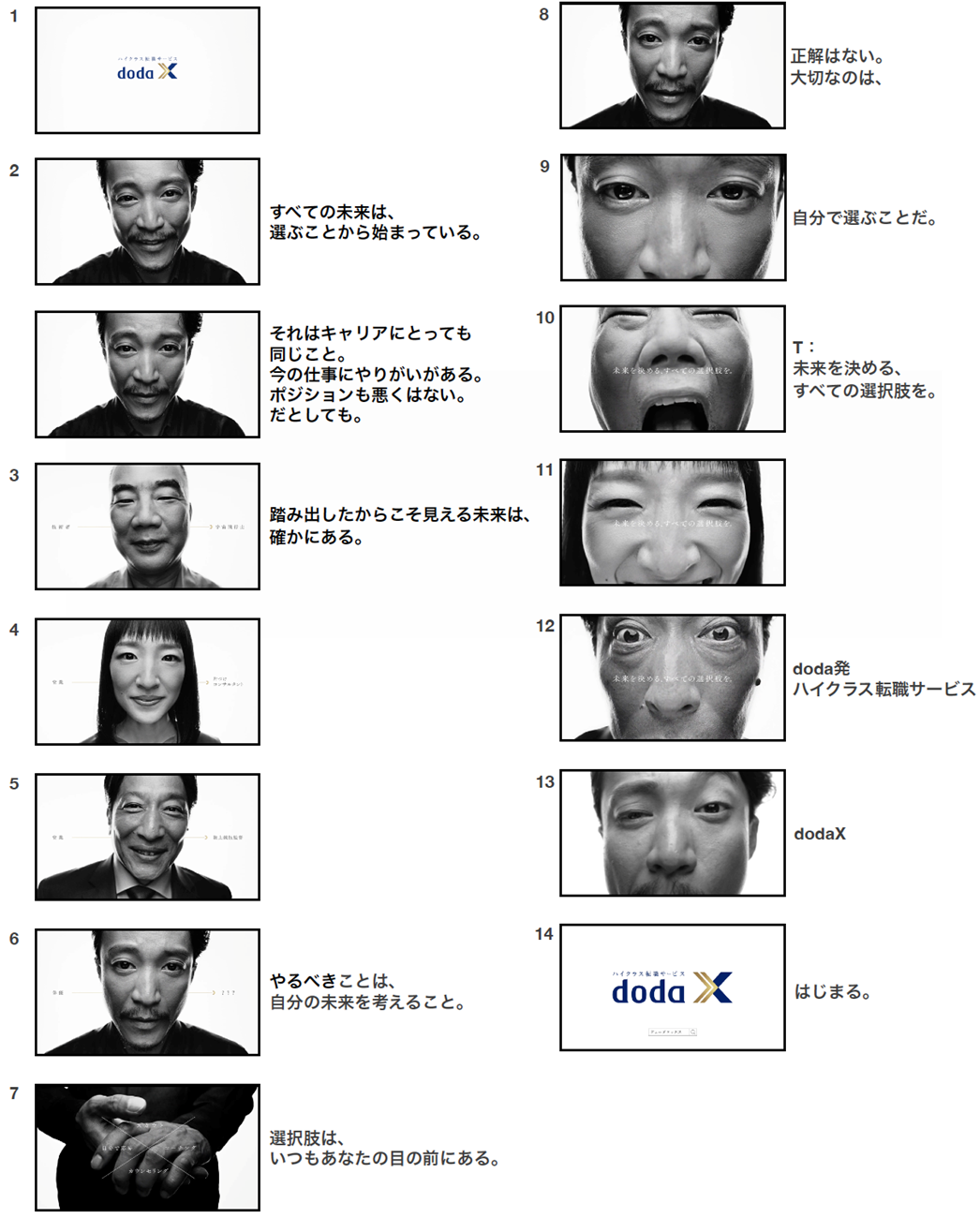 人生は「選択」の連続です。そしてその「選択」が未来を作っていきます。「はたらく」にまつわる社会環境の変化の激しい今、はたらく人々に必要なのは、自分のキャリアを自分で考え、選び取る「キャリアオーナーシップ」だと「doda X」は考えています。今回のCMには、転職を考える人、さらには世の中のすべての人が、誰でもない自らの意思で選択する、また自ら未来を選ぶという姿勢を応援したい、という強い想いを込めました。