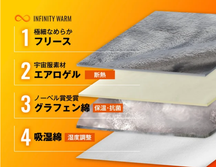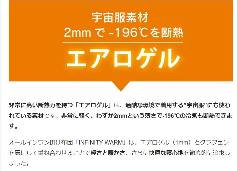厚さ2mmで-196℃を断熱する宇宙服素材”エアロゲル”とノーベル物理学賞を受賞した素材”グラフェン”の最新2大素材を取り入れ、真冬の寒さにも1枚で暖かいオールインワン掛け布団「INFINITY WARM」(インフィニティ ウォーム)