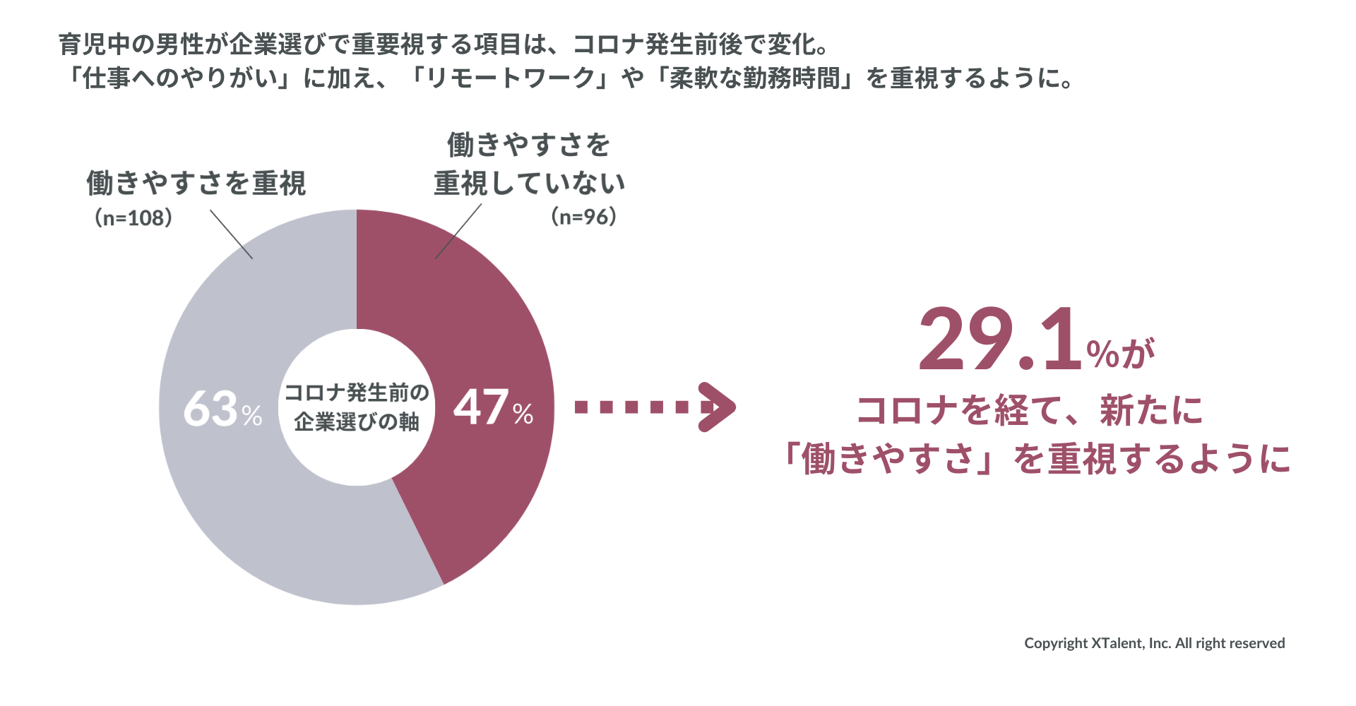 新型コロナウィルス流行以前・以後で育児中の男女の企業選びの変化を分析した結果、男性は働きやすさを重視する傾向が高まり、女性は変化が少なかった。また、育児中の男性で働きやすさと仕事のやりがいのいずれも重視する人は18.1%から89.2%に増加。コロナ禍で、リモートワークや柔軟な勤務時間などフレキシブルな働き方が広く認められるようになり、働きやすさを求める傾向が高まった。
