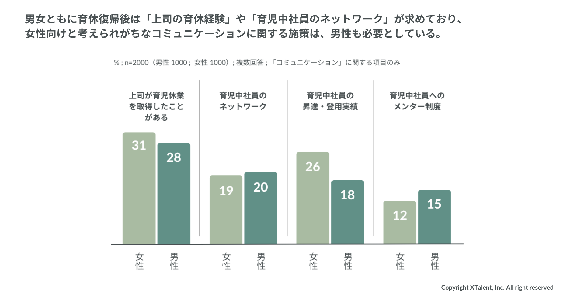 2023年2月に公開した「育休を取得した男性社員1000人に聞いた より働きやすくなるために必要なこと」調査レポートでは、男女ともに育休復帰後に必要な要素として、「上司の育休経験」や「育児中社員のネットワーク」が求められており、男性もコミュニケーションに関する施策を必要としていることが分かった。また、女性よりも男性の方が育児中社員のネットワークやメンター制度の必要性を高く評価していることも明らかに。